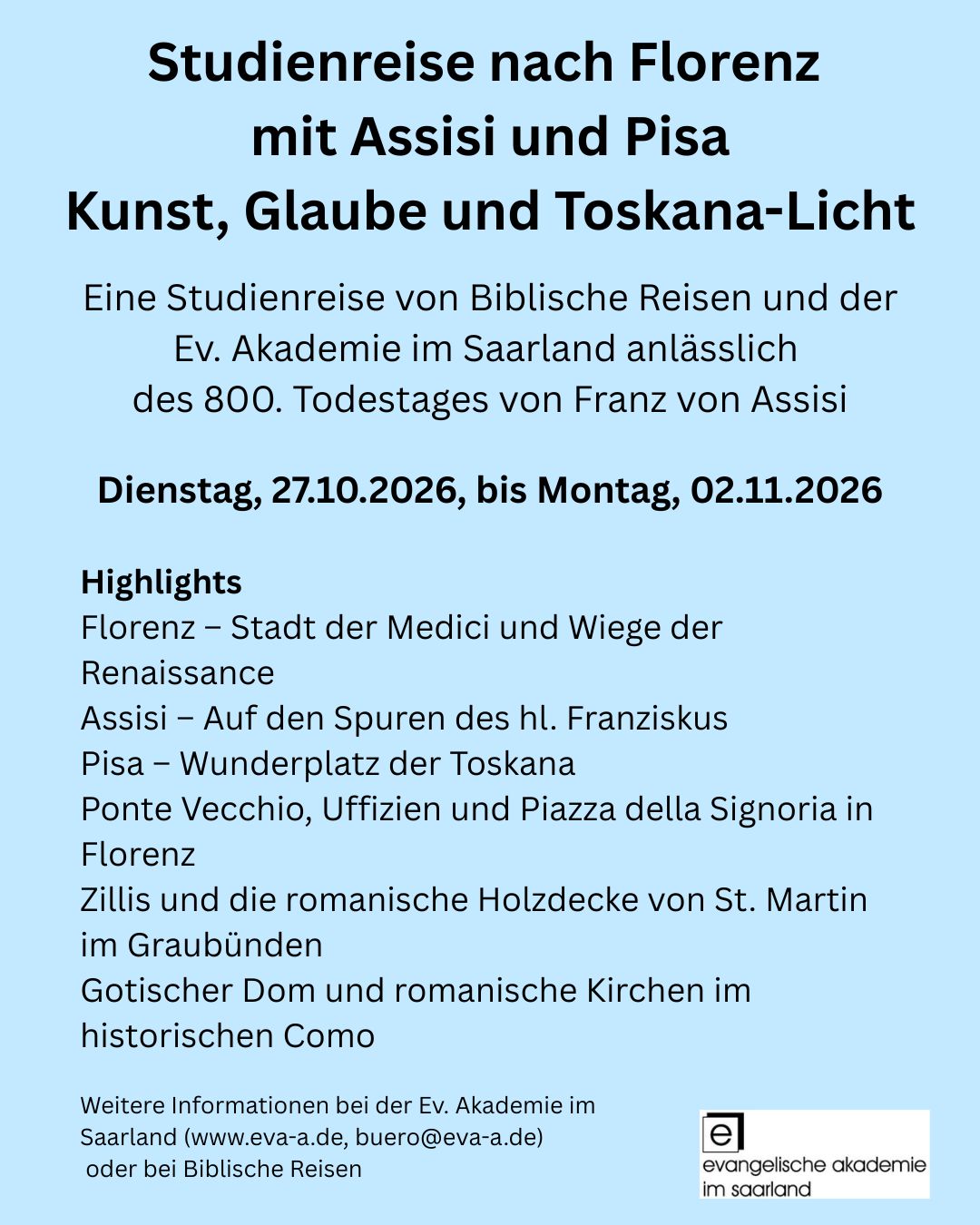 | Im Herbst 2026 jährt sich zum 800. Mal der Todestag von Franz von Assisi – eines der eindrucksvollsten Glaubenszeugen der Kirchengeschichte. Seine radikale Lebensform, seine Nähe zu den Armen und zur Schöpfung und sein neues Verständnis christlicher Nachfolge prägten die Christenheit nachhaltig -bis heute. Aus diesem Anlass bietet die Evangelische Akademie im Saarland gemeinsam mit Biblische Reisen eine mehrtägige Reise nach Florenz, Pisa und Assisi an. Mehr Infos zur Reise und zur Anmeldung: hier. ![]() |